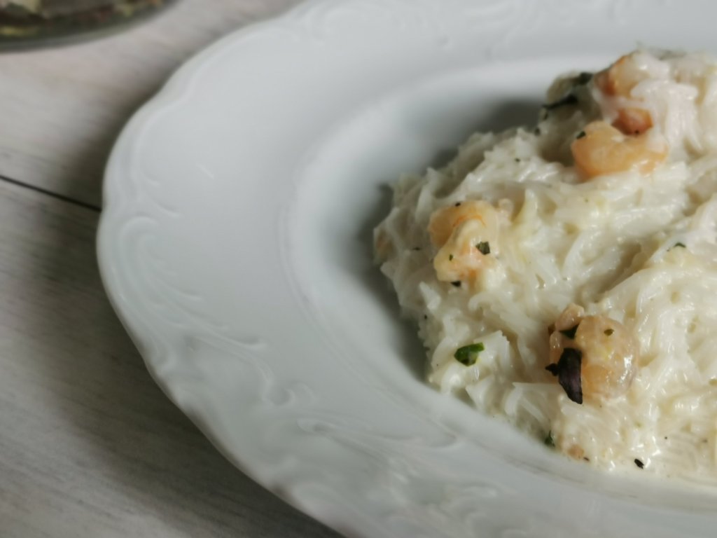 Prijateljica mi velikokrat omenja, kako imajo njeni radi kozice v rižoti, sama pa jih še nikoli nisem pripravljala same, vedno v mešanici morskih sadežev. Zadnjič pa sem našla pošteno znižane in sem jih kupila. Odločila sem se, da jih bom naredila v smetanovi omaki in za otroke z riževimi rezanci.