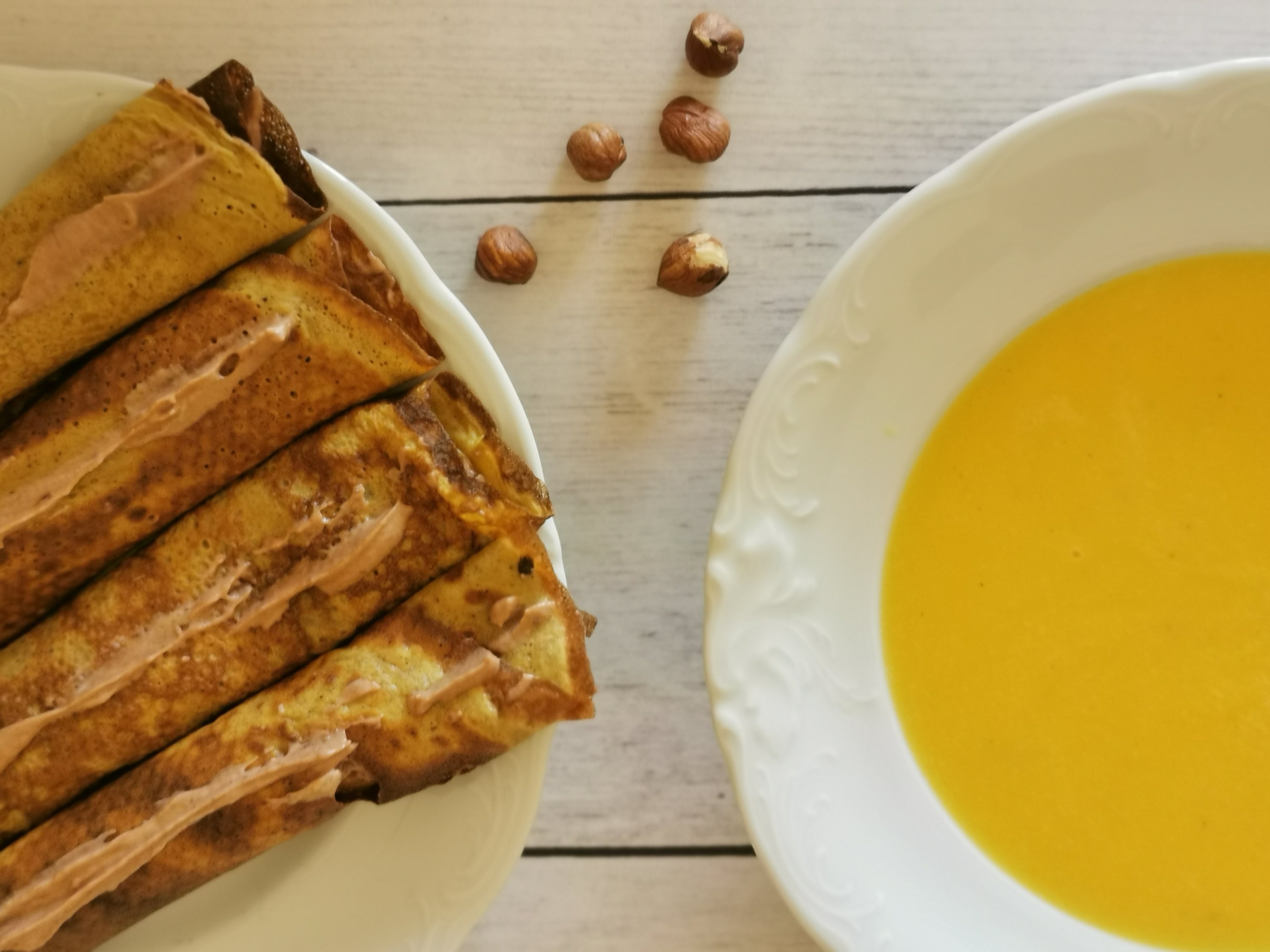 LCHF : bučna juha, palačinke iz razmaščene lešnikove moke, namazane z namazom iz stepene smetane in Pajsotelle