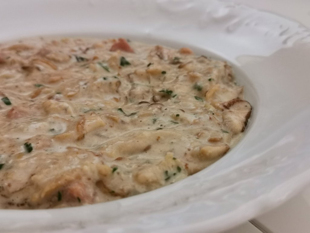 LCHF : gobova juha s slanino, palačinke iz razmaščene lešnikove moke, namazane z namazom iz stepene smetane in Pajsotelle