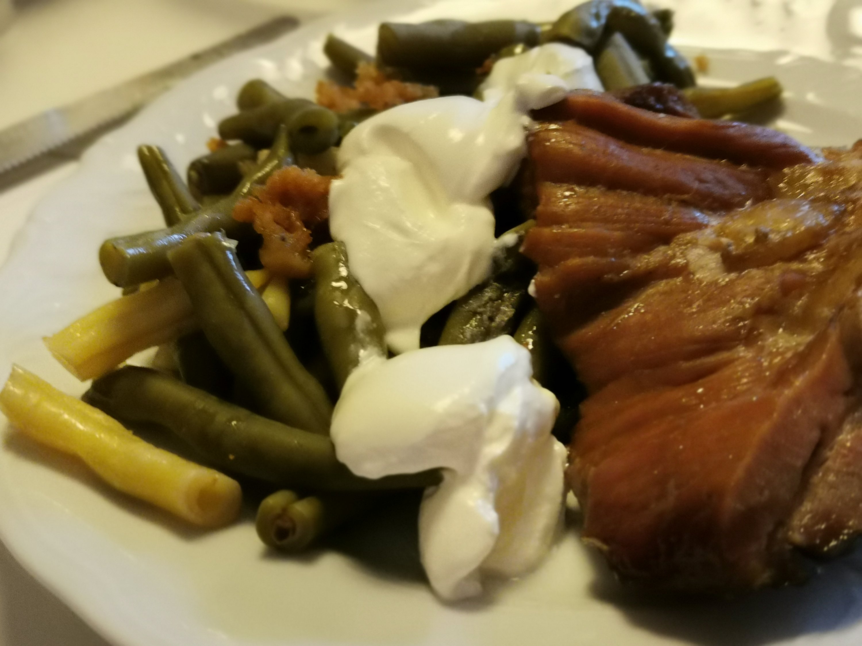 LCHF : stročji fižol z ocvirki in kislo smetano, dimljena rebra