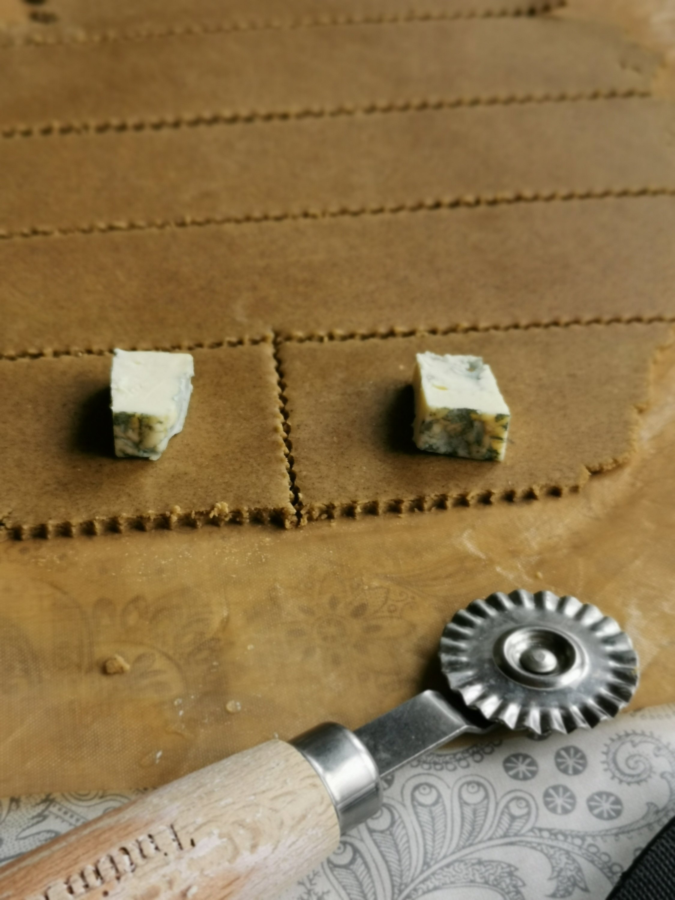 Za polnjene testenine testo razrežemo na pravokotnike, položimo nadev (sir z modro plesnijo, skuta z drobnjakom,…) ter testo prepognemo in na robovih stisnemo.