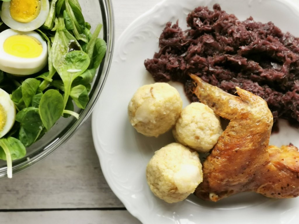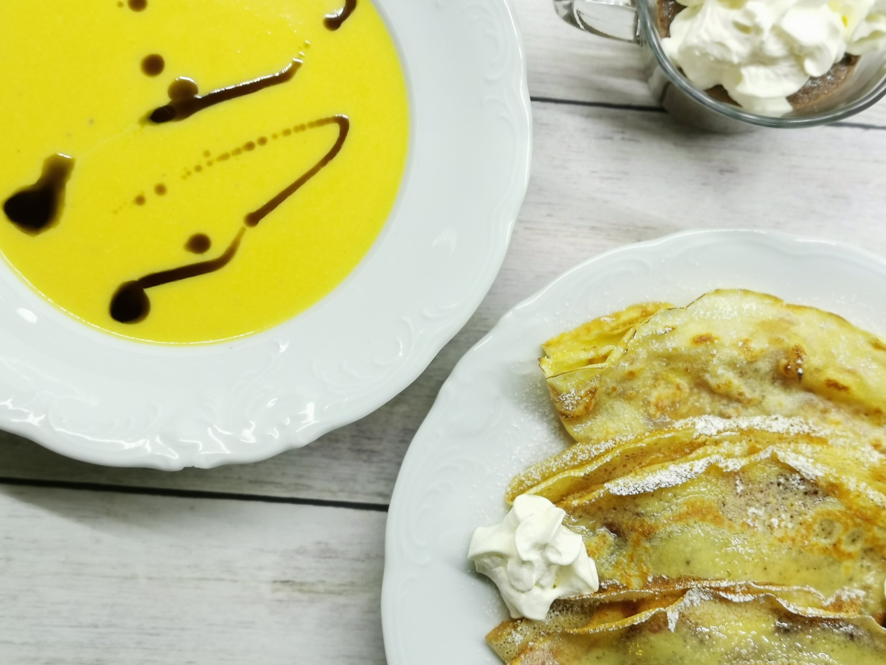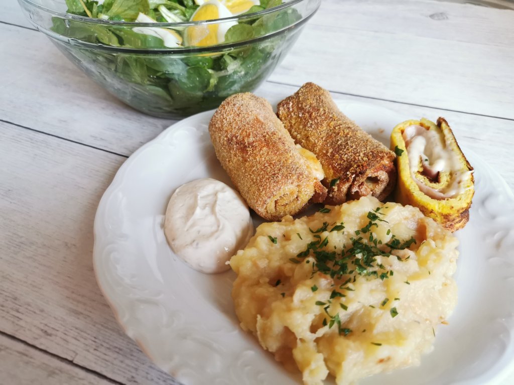 LCHF : bučna rolada, pomaka (kisla smetana, majoneza, kapre, sol), motovilec z jajčko