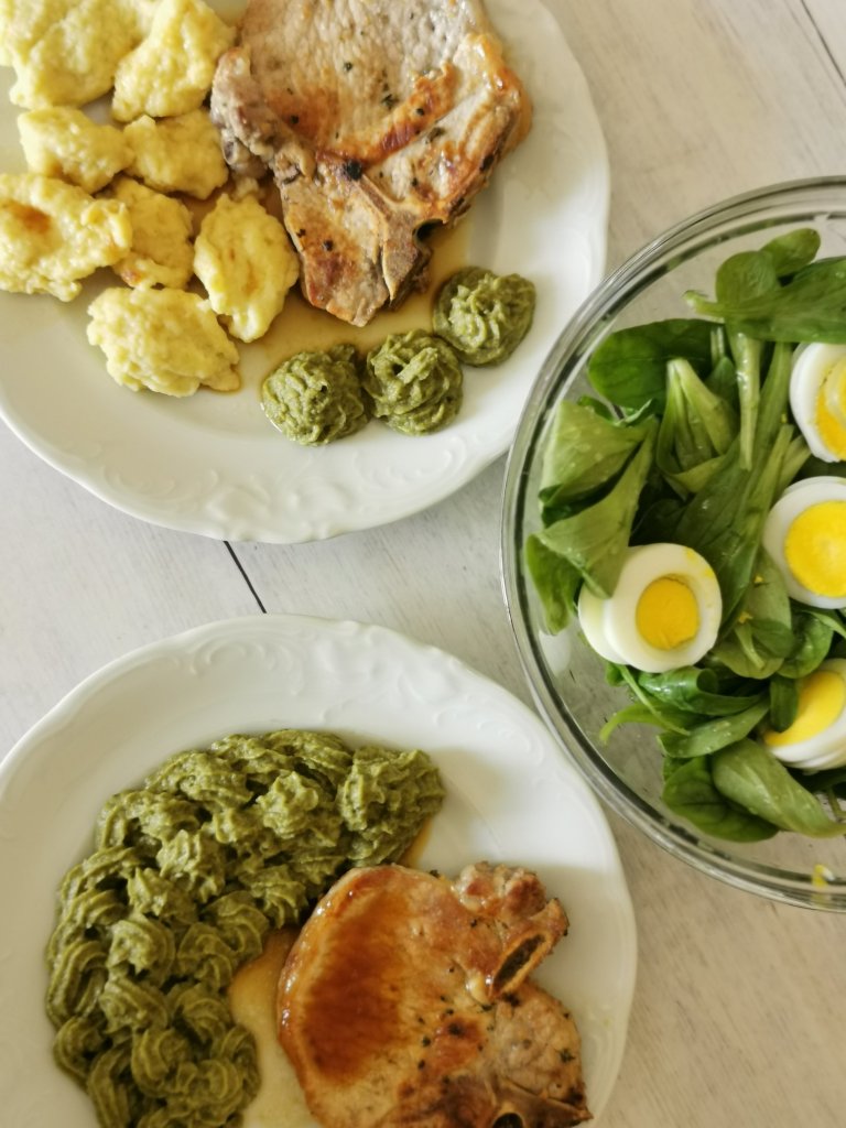LCHF : dušeno zelje, pečena piščančja bedra, motovilec z jajčko