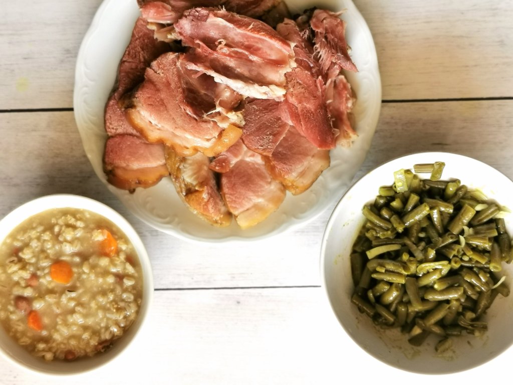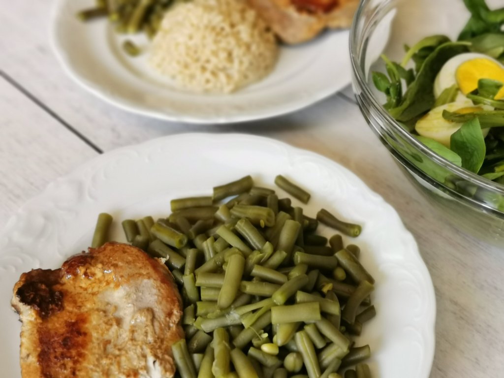 LCHF : stročji fižol v solati, kuhana dimljena svinjska krača