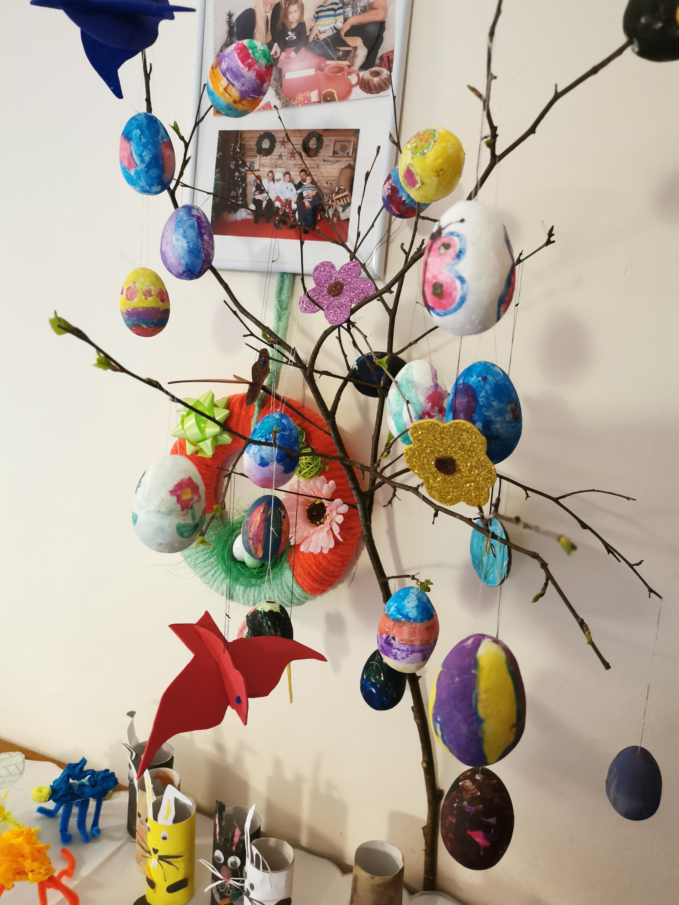 Uredili smo velikonočni kotiček in pobarvali jajčka. Ena s klasično čebulno kopeljo, druga pa z Dino različico, ki si jo lahko pogledate tukaj.