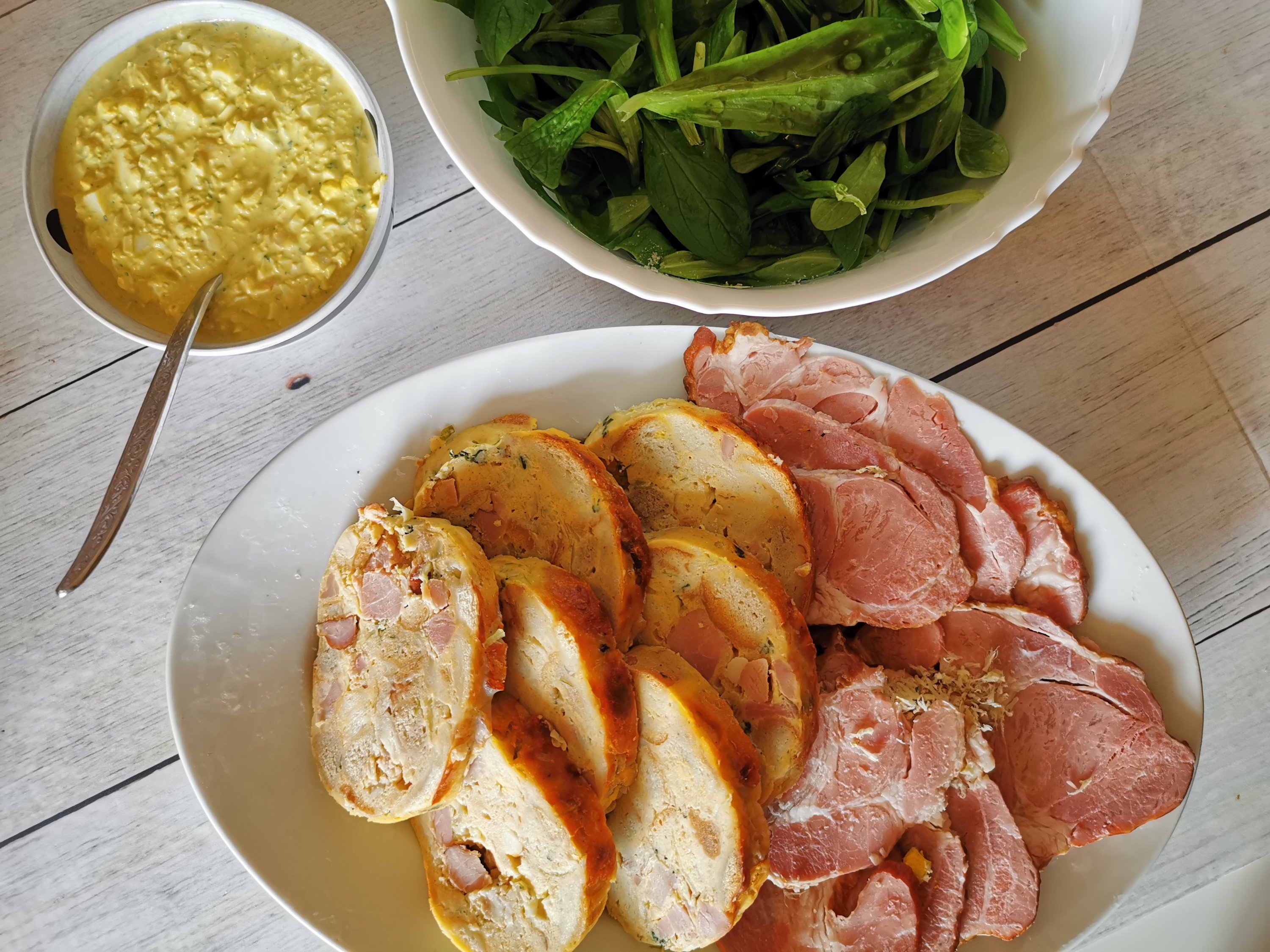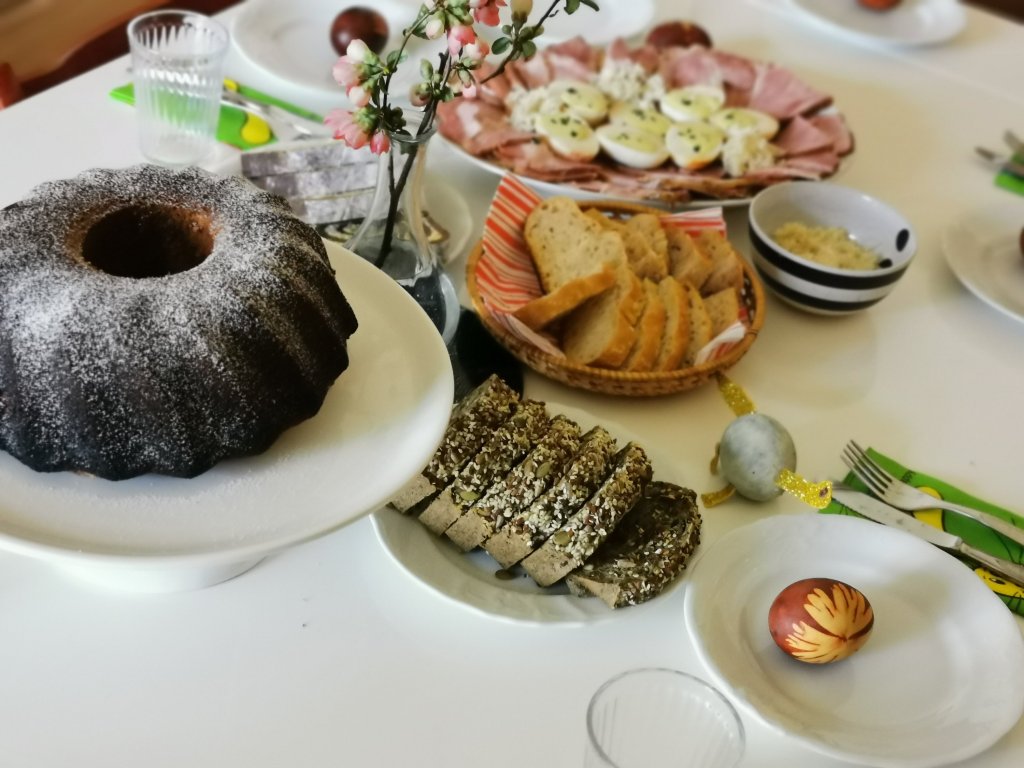 Zajtrk: šunka, hren, pirhi, polnjena jajca s hrenovo kremo #LCHF kokosova potica, #LCHF kruhek, marmorni kolač za 👧 🧑 👧, kruh z drožmi za 👧 🧑 👧