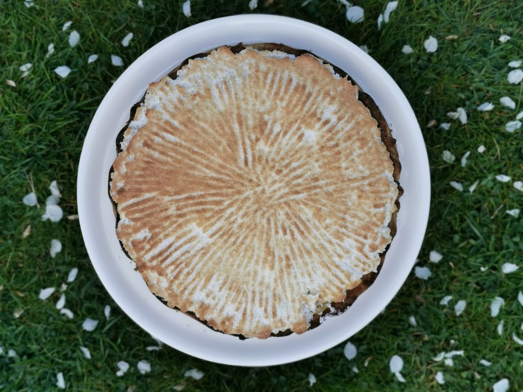 Pečico ogrejemo na 250° C in prižgemo zgornji žar. Pito damo na najvišjo lego v pečici. Meringa se bo ‘karamelizirala’ v zelo kratkem času (2, 3 minuti) , zato bodite veš čas zraven.