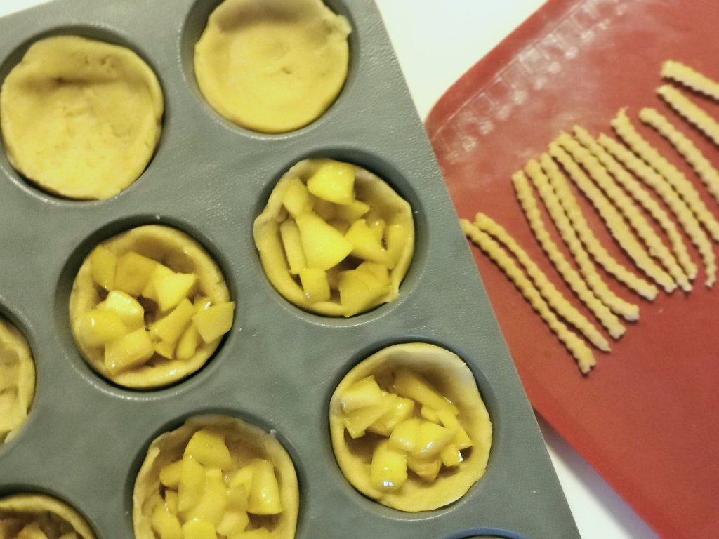 Jabolka razrežemo na kocke in jih na žlici masla podušimo, da so mehka, nato jih posujemo s sladkorjem. Ko sladkor karamelizira, jabolka damo v košarice, ki smo jih oblikovali v modelu za kolačke in okrasimo z ostanki testa.