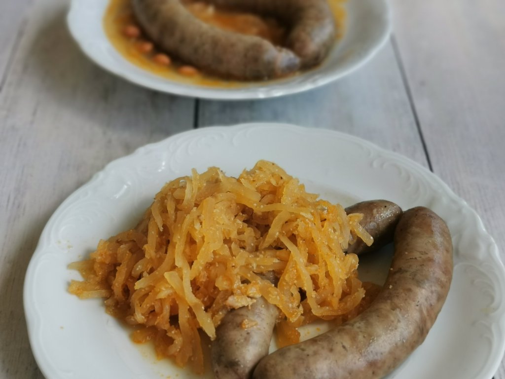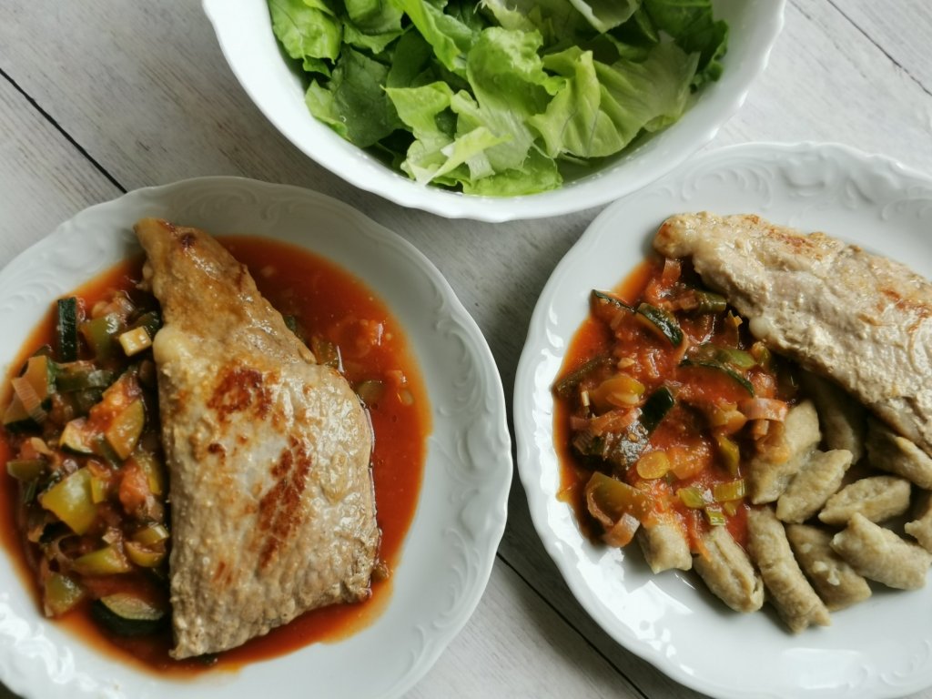 - Omaka prepražena zelenjave (bučke, pora, paprike) in paradižnikove omake