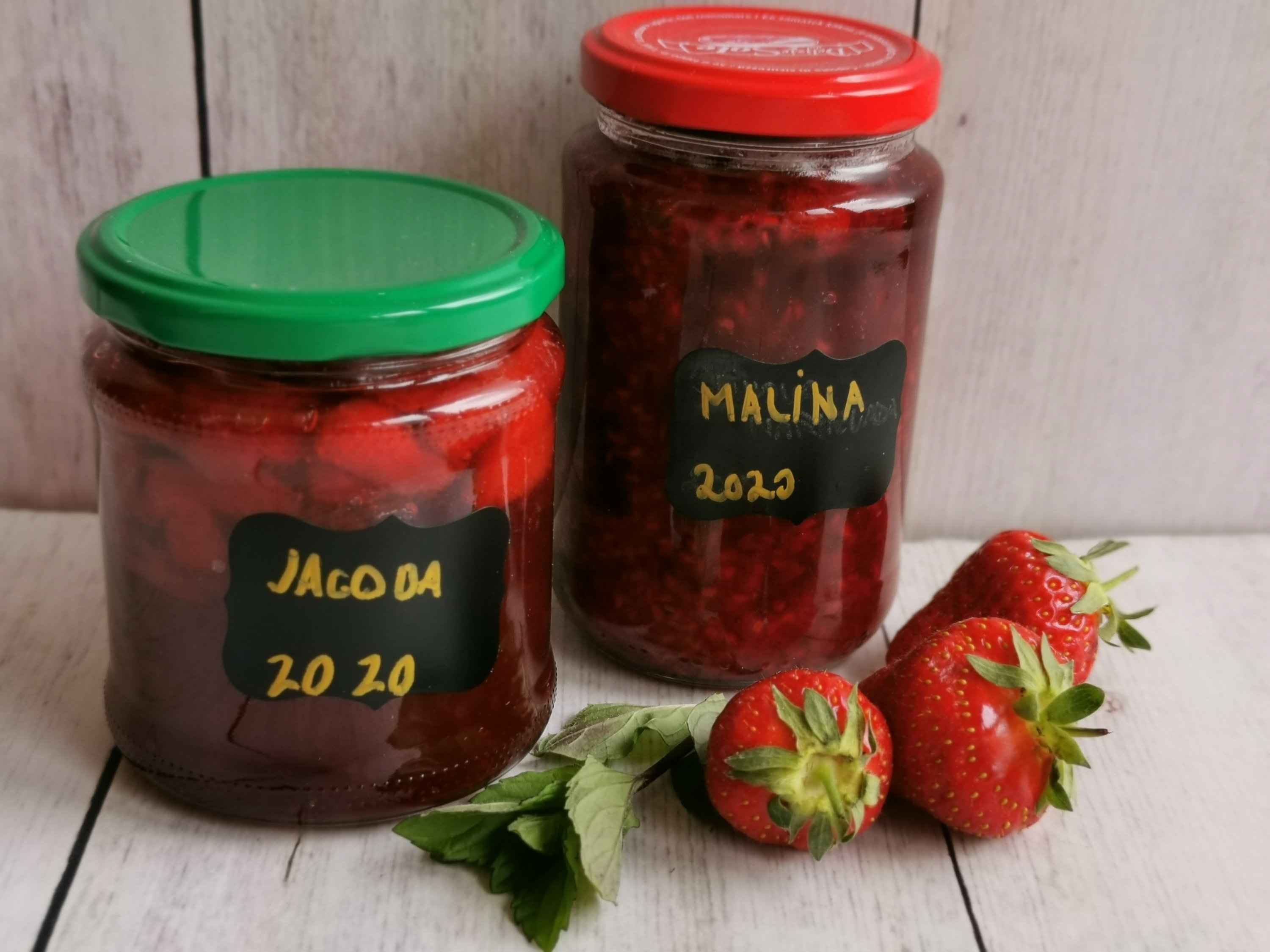 Ta teden smo pripravili sveže ocvirke in skuhali jagodno marmelado (jagode smo kupili na Jančah pri Ljubljani) in marmelado iz domačega jagodičevja (robide, maline, jagode, borovnice, ribez), ki smo ga imeli zmrznjenega in nismo porabili čez zimo.