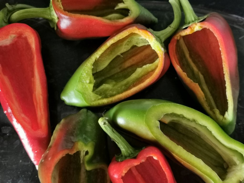Večje paprike prerežemo na pol, odstranimo semena.