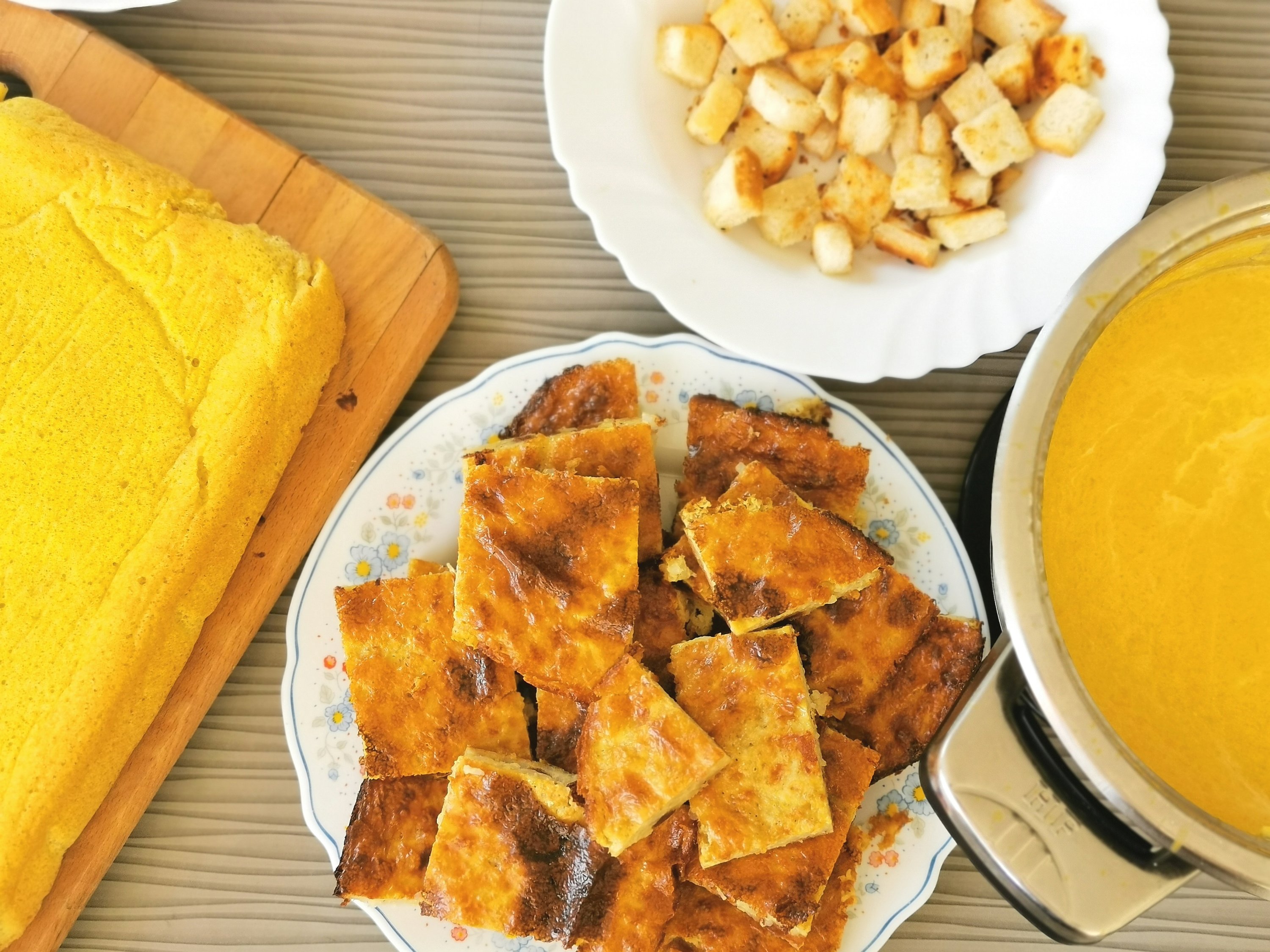 LCHF : bučna juha, brezhidratni biskvit s koščki čokolade