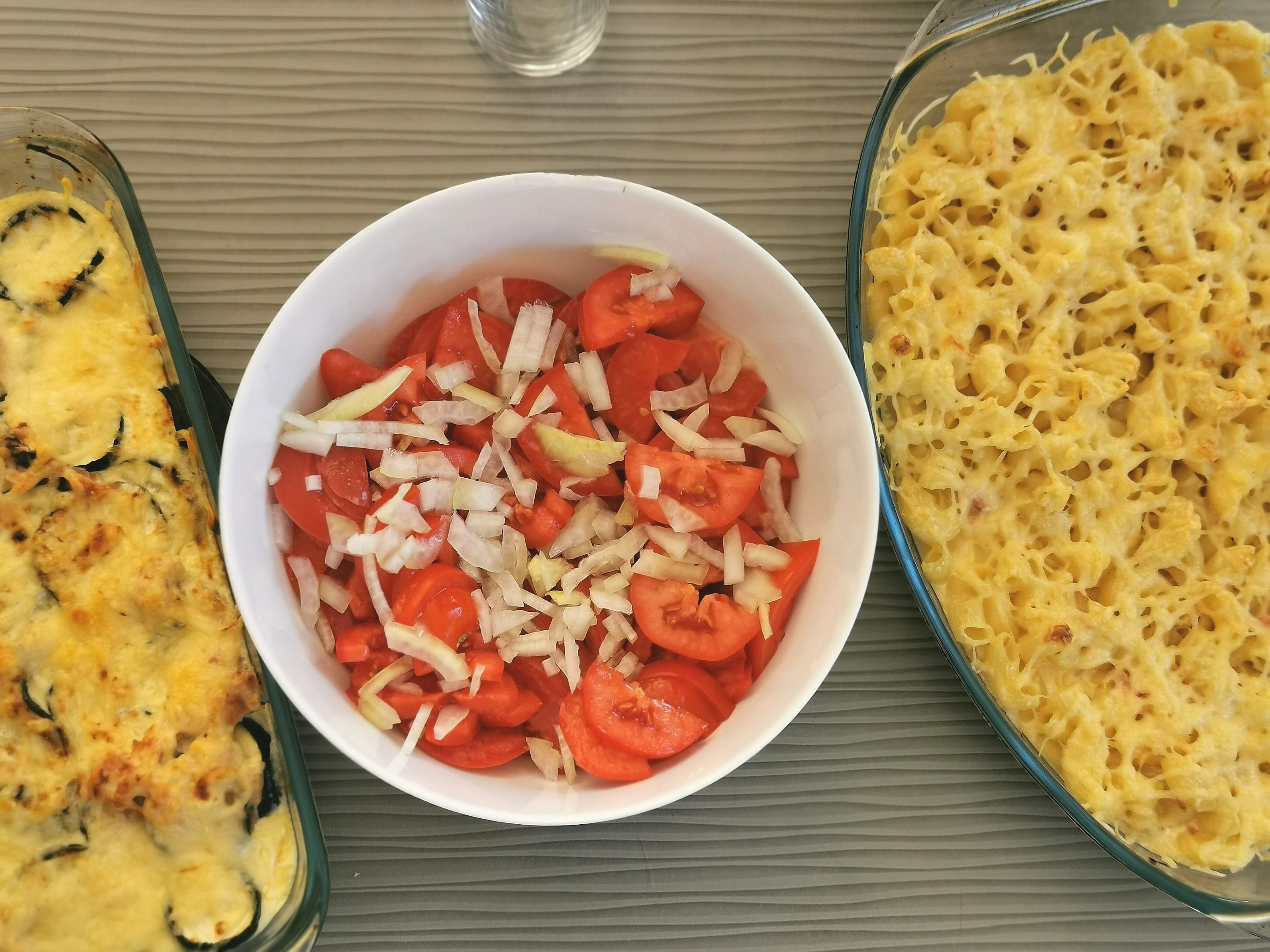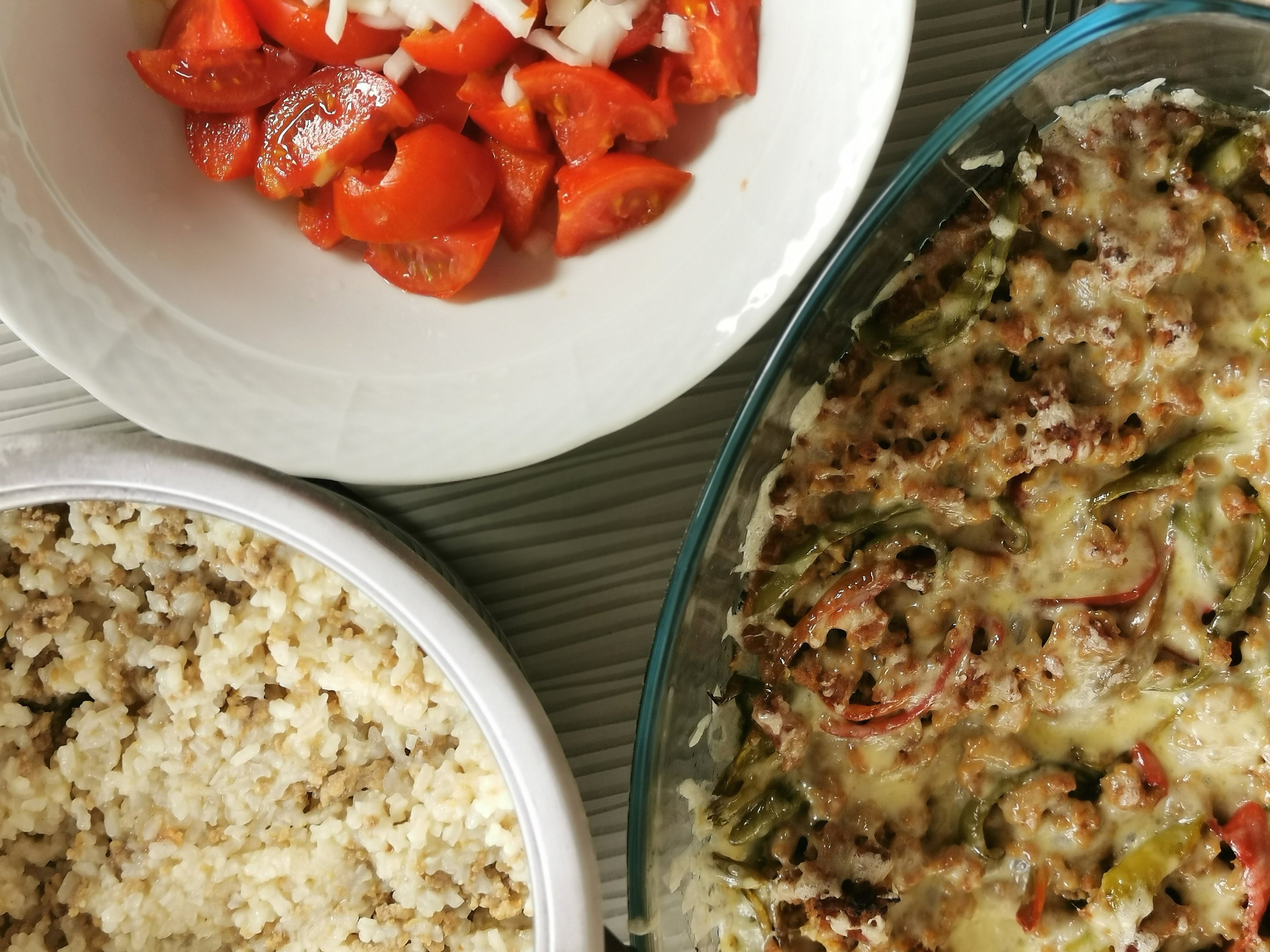 LCHF: gratinirana paprika z mletim mesom, paradižnikova solata