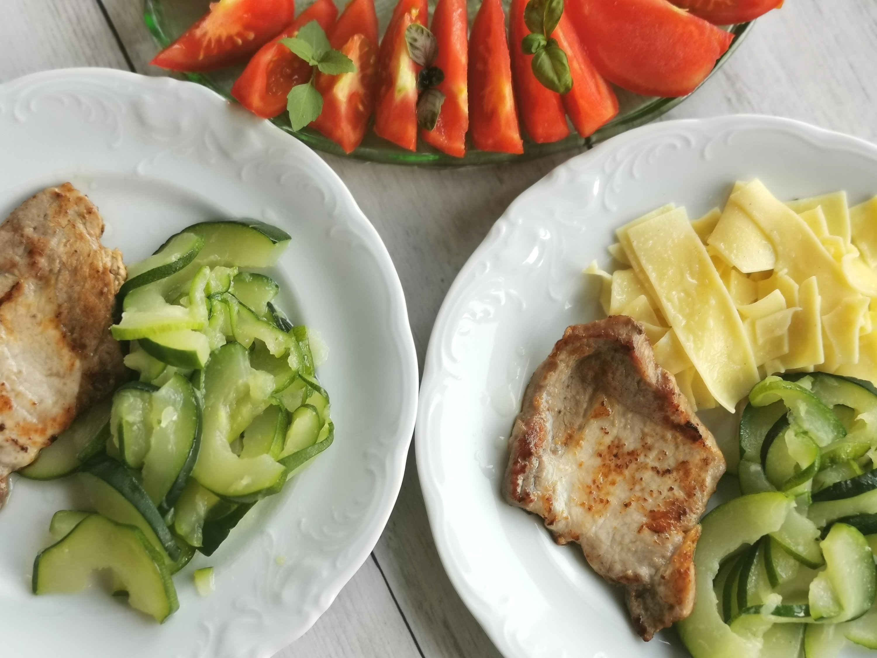 Pokuhane bučke: bučke sem na tanko narezala, jih pokuhala v slanem kropu (10 minut) in odcedila.