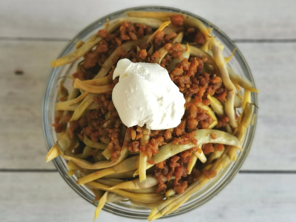 Stročji fižol skuhamo v slani vodi, da odcedimo in izdatno zabelimo z ocvirki. Zraven postrežemo kislo smetano.