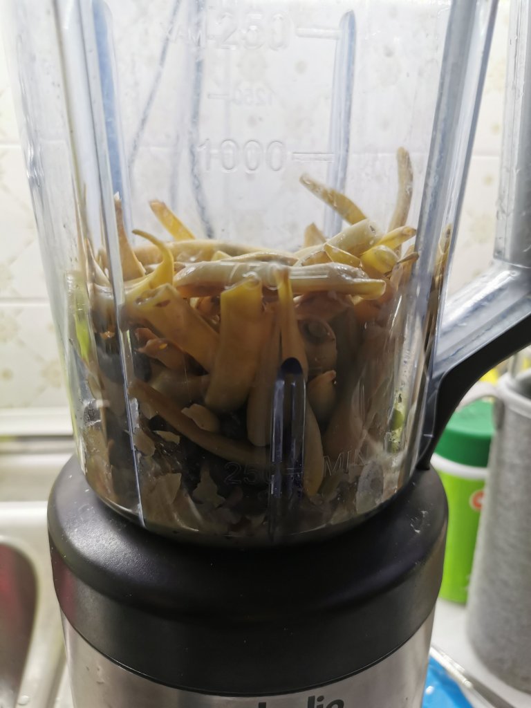 Stročji fižol v blenderju ali pa s paličnim mešalnikom dobro zmeljemo, nato se precedimo skozi pasirnik.