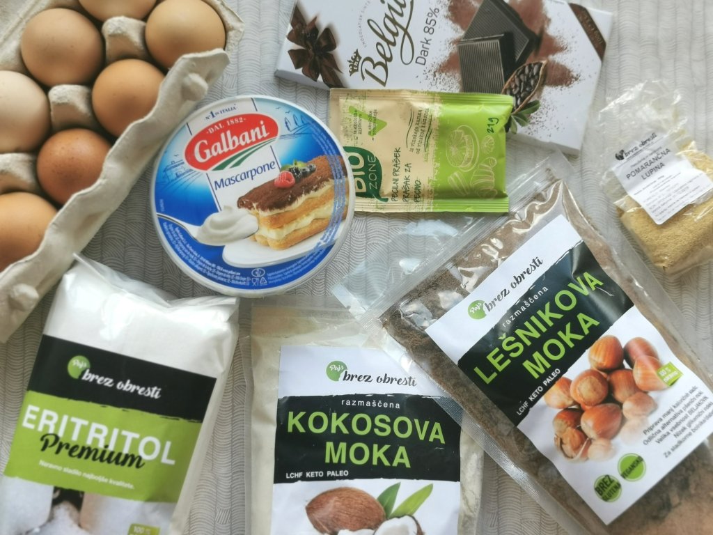 Cela jajca, sol in eritritol mešamo z mešalnikom tako dolgo, da se količina podvoji, postopoma dodajamo maskarpone, konjak moko, razmaščeno lešnikovo moko, razmaščeno kokosovo moko in vinski kamen. Dobro premešano maso damo v pomaščen pekač in ga pečemo dvajset minut na 175°C. Če je pečeno, preverimo z zobotrebcem.