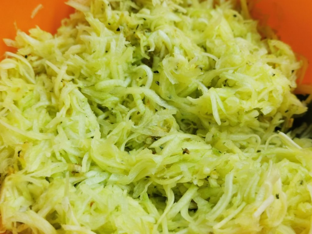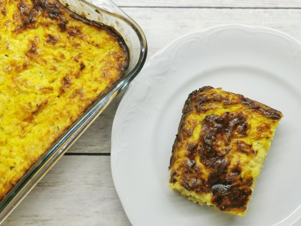 Bučke naribamo in nasolimo ter najbolje čez noč pustimo. Tik pred pripravo jih ožamemo in zmešamo s skuto, česnom v prahu in sušeno domačo zelenjavo. Ne mešamo preveč. Polovico naložimo v steklen pekač ter prelijemo s polovico polivke (jajca, kisla smetana, sol) ter ponovimo z drugo polovico buče s skute ter polivke.