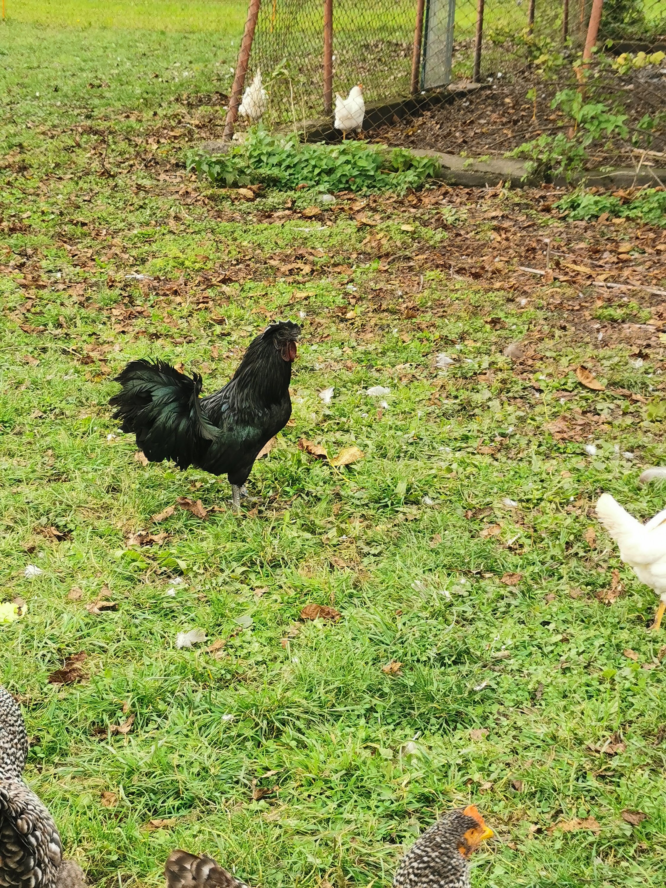 Naša pernata družina se je povečala še za črnega petelinčka pasme ayam cemani, ki se je s svojimi tremi damami pridružil naši skupnosti. Naši goski (Julijan in Julija) se ne pritožujeta.