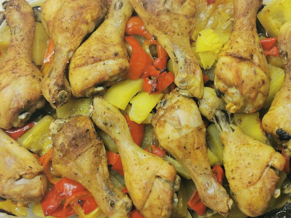 Bučko, malancan, papriko sem narezala na rezine in jo položila na pekač, čez njo sem naložila začinjena piščančja bedra in pokrito pekla 45 minut na 175°C. Nato sem odkrito pekla še nekaj minut, da se je kožica lepo zapekla.