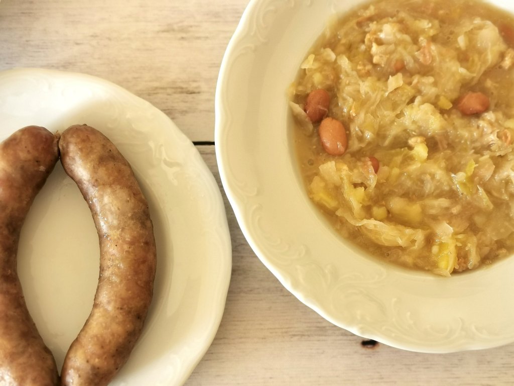 LCHF: dušeno zelje, klobasa, mandljev marmorni kolač