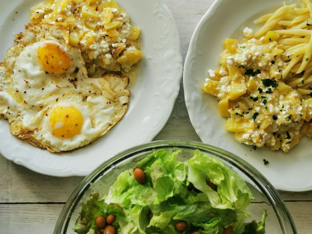 LCHF : buča (maslenka) z zrnatim sirom, jajce, solata