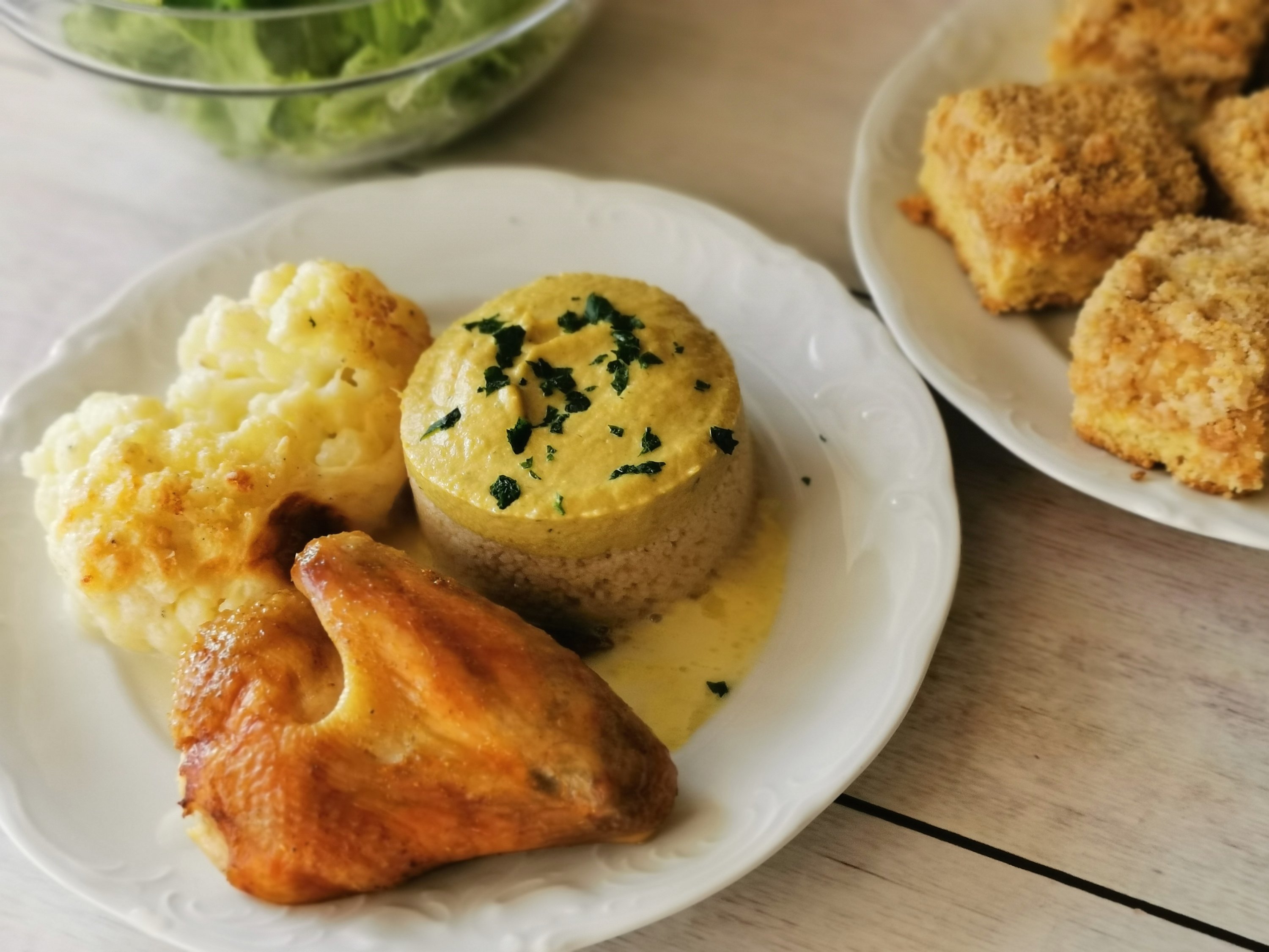 LCHF: kurja juha, gratinirana cvetača z bešamelom in parmezanom, pečen piščanec, zelena solata