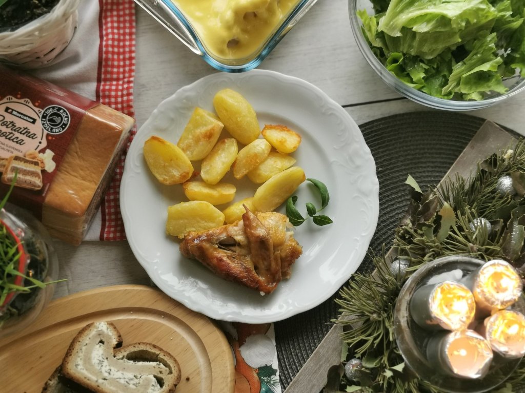LCHF: pečen piščanec, cvetača z domačo majonezo, zelena solata, pehtranova potica