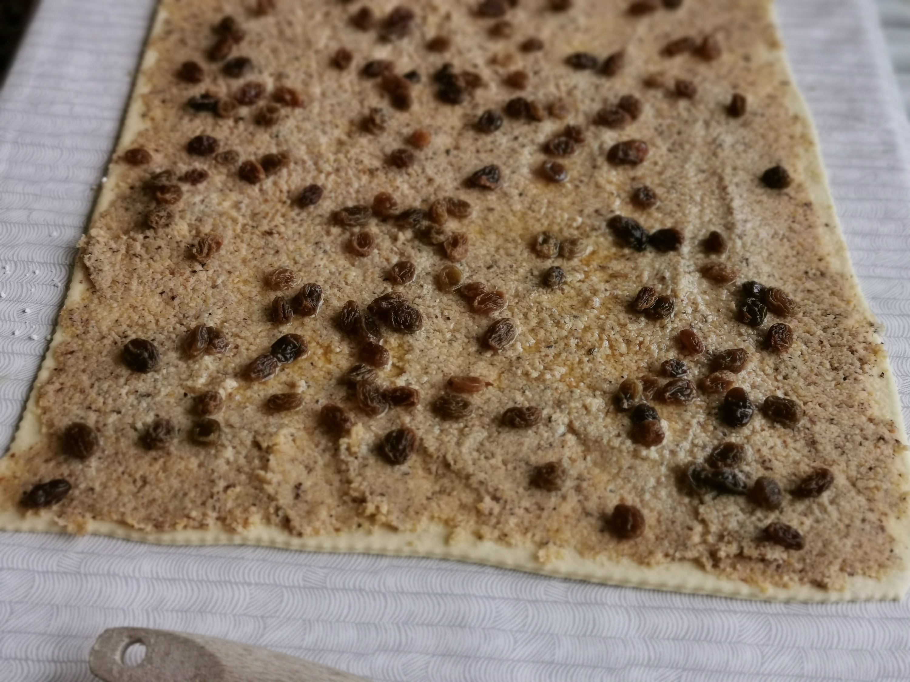 Testo, ki je vzhajal, ponovno pregnetemo in razvaljamo na kvadrat. Nanj namažemo nadev in posujemo z namočenimi rozinami.