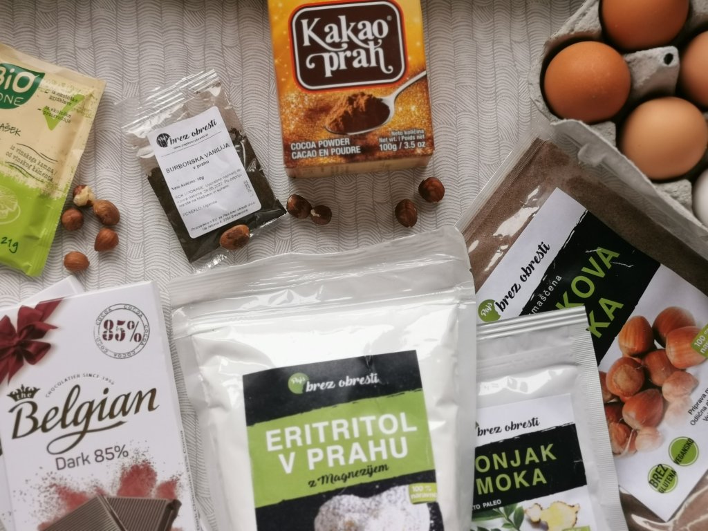 Jajca, zmešamo z eritritolom in maslom, da se speni. Postopoma dodajamo ostale sestavine, da dobimo gladko gosto zmes. Na koncu dodamo oreščke. Maso enakomerno razporedimo po pekaču, ki smo ga zaščitili s papirjem za peko.