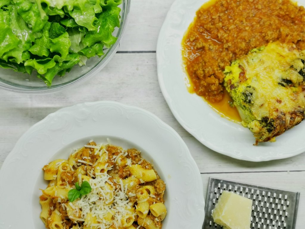 LCHF: gratiniran brokoli, omaka iz mletega mesa, zelena solata