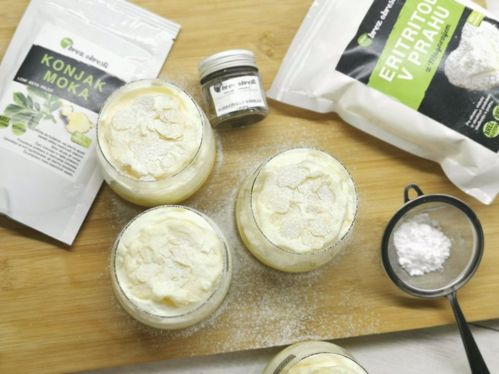 Sladka smetana, maskarpone in eritritol stepemo in damo na ohlajeno vanilijevo kremo.