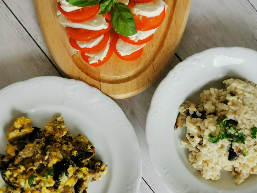 LCHF: temni hlebček, marele z jajčko, paradižnik z mocarelo
