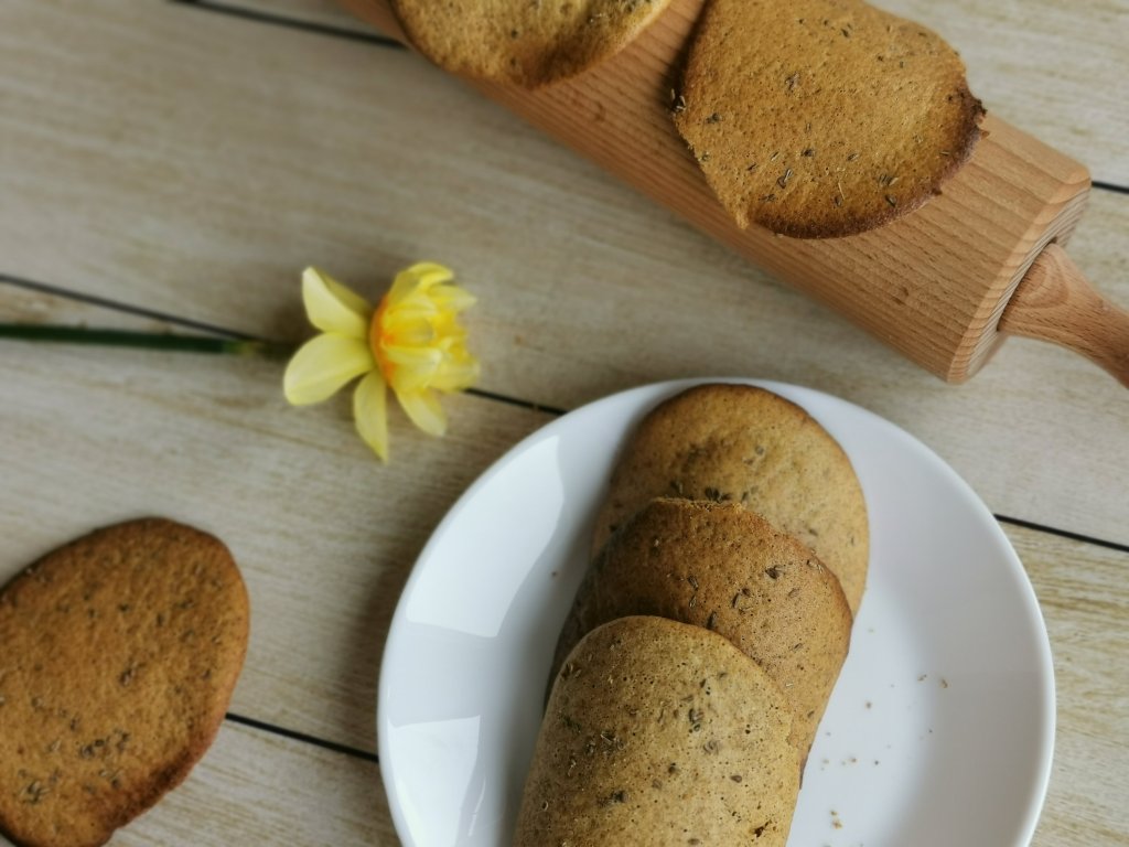 Pečemo 8-9 minut. Praviloma so janeževi upognjenci pečeni, ko začne rjaveti zunanji rob. Makadamijeva moka je temnejša, zato nam lahko hitro pobegnejo.