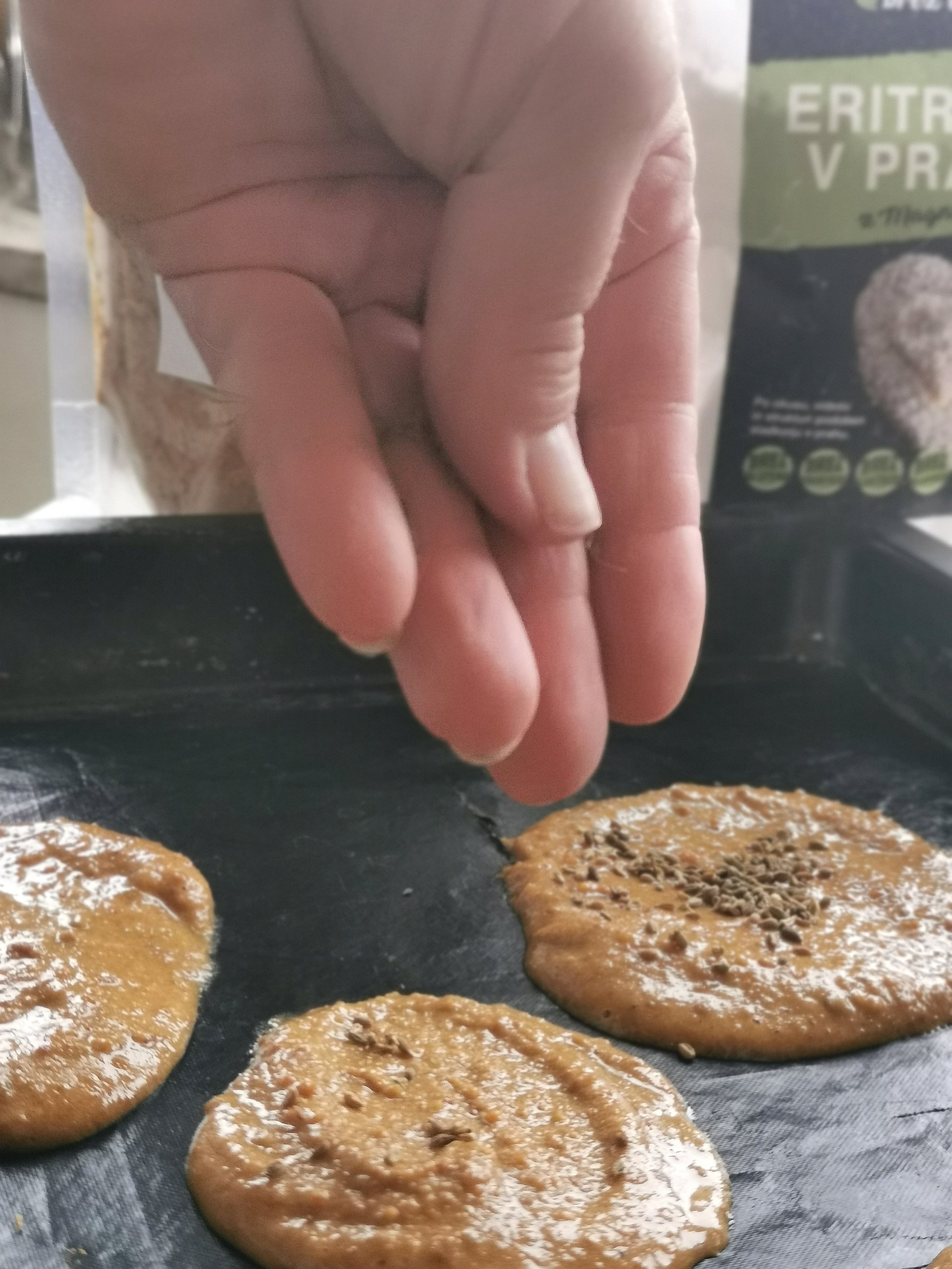 Na pekač položimo peki papir. Maso z žlico (1 žlica 1 upognjenec) nanašamo na peki papir. Z žlico oblikujemo kroge nekje premera deset centimetrov. Na oblikovane kroge potresemo janež.