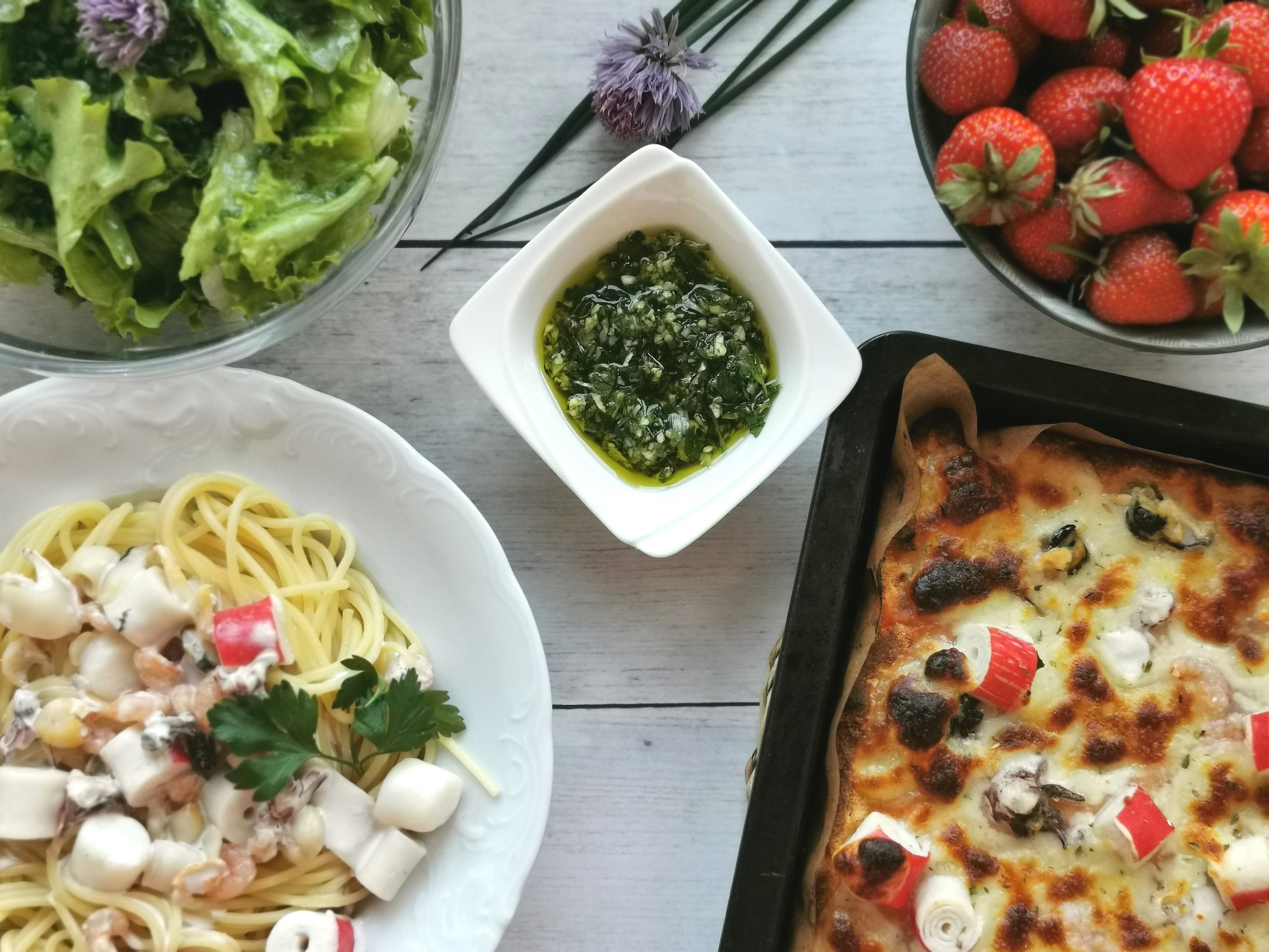 LCHF: pica z morskimi sadeži, tržaška omaka, zelena solata, jagode