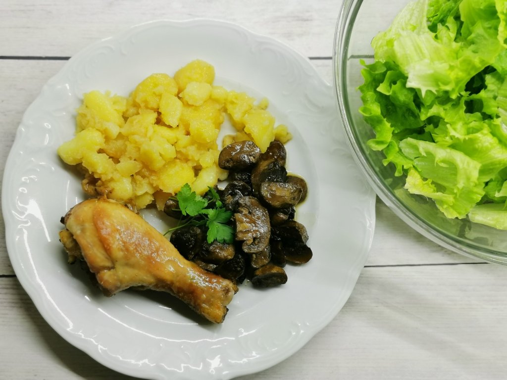 - Šampinjoni pečeni v pečici skupaj s piščančjimi bedrami