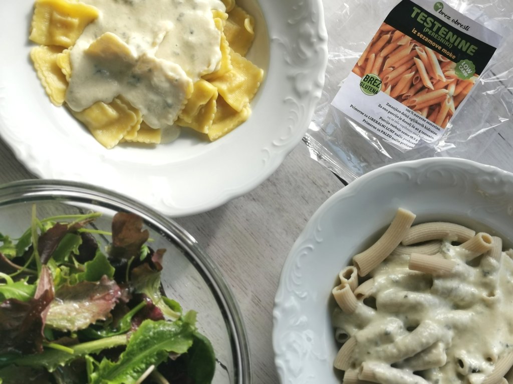 LCHF: peresniki iz sezamove moke, sirova omaka, solata