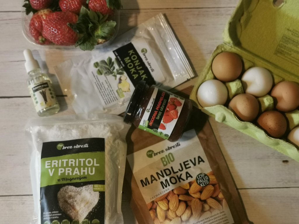 Biskvit zapremo in po želji okrasimo s smetano, sadjem in eritritolom v prahu.