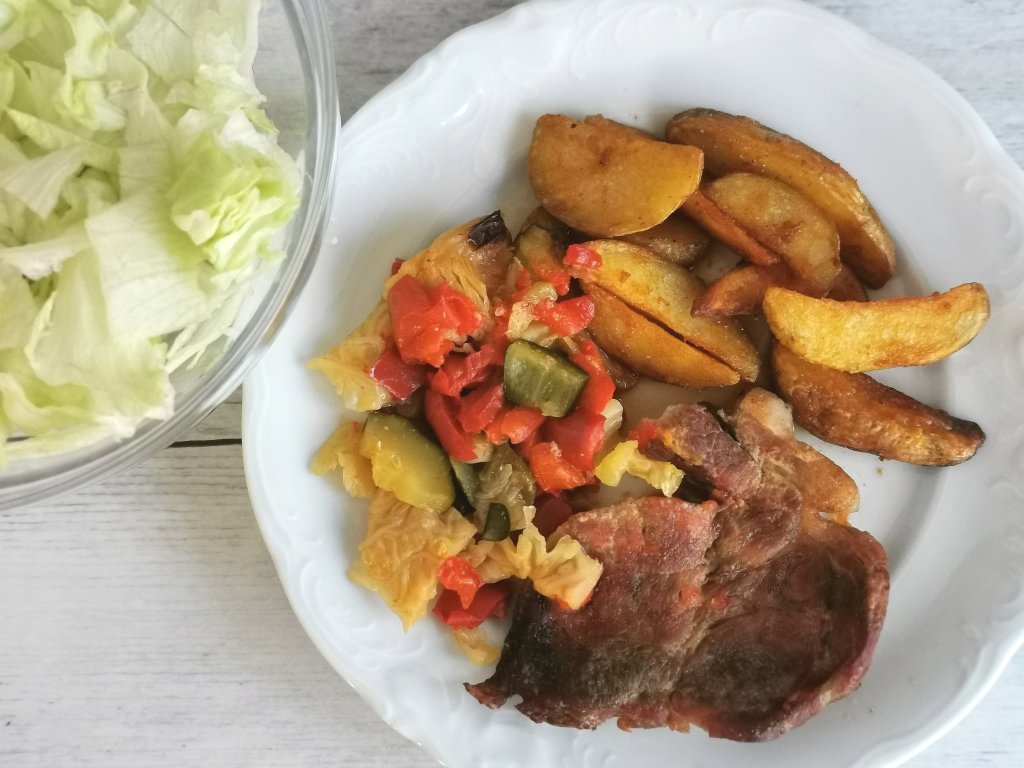 - Svinjska vratovina pečena z zelenjavo (paprika, ohrovt, bučke) v pečici