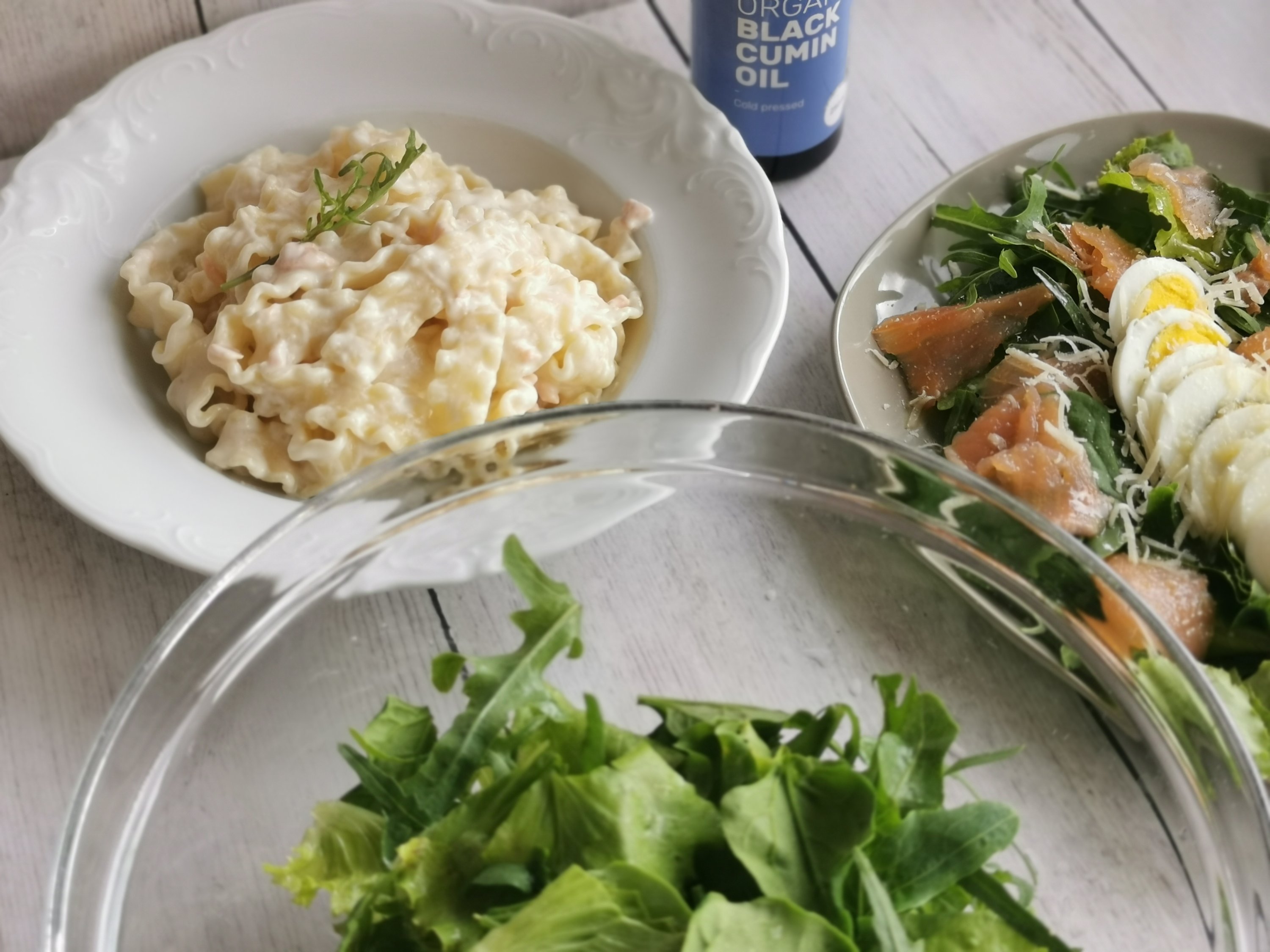 LCHF: Mešana solata, dimljeni losos, kuhana, jajca, parmezan, olje iz črne kumine