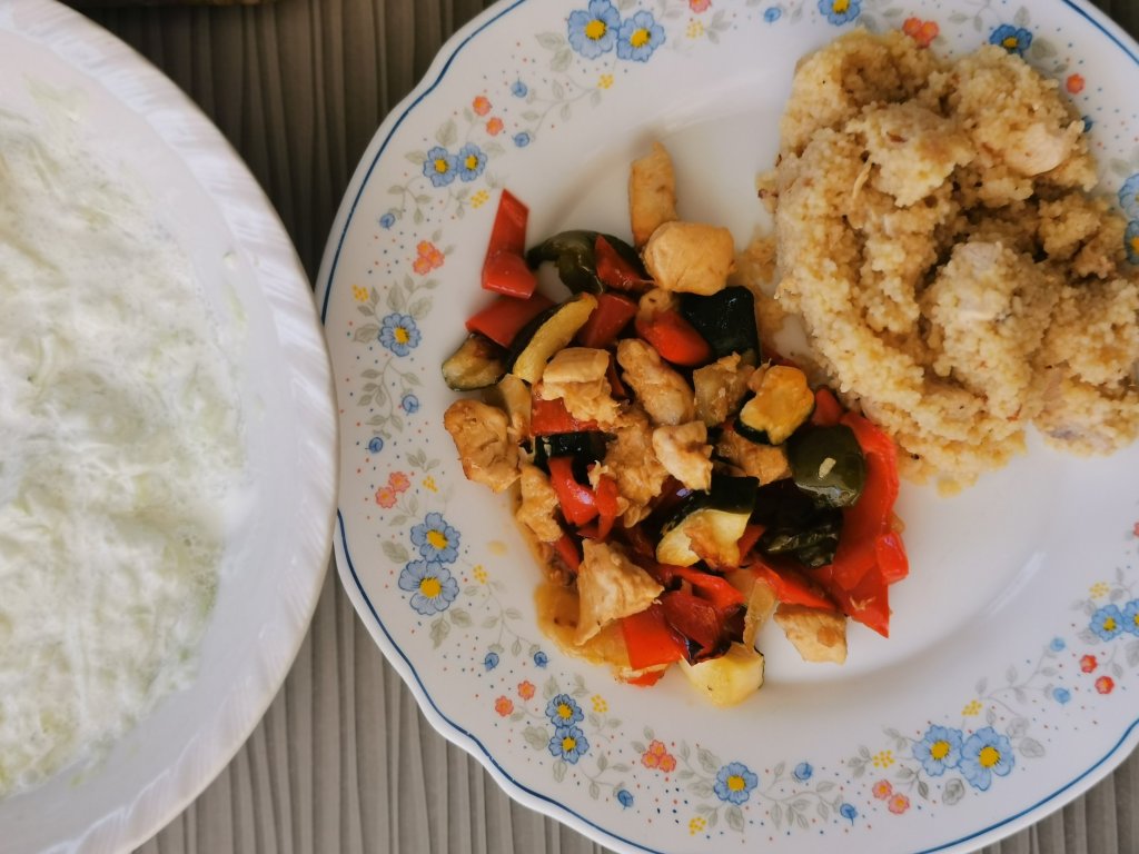 LCHF: pcene bučke, piščančji zrezek pečen s sezamom, šopska solata