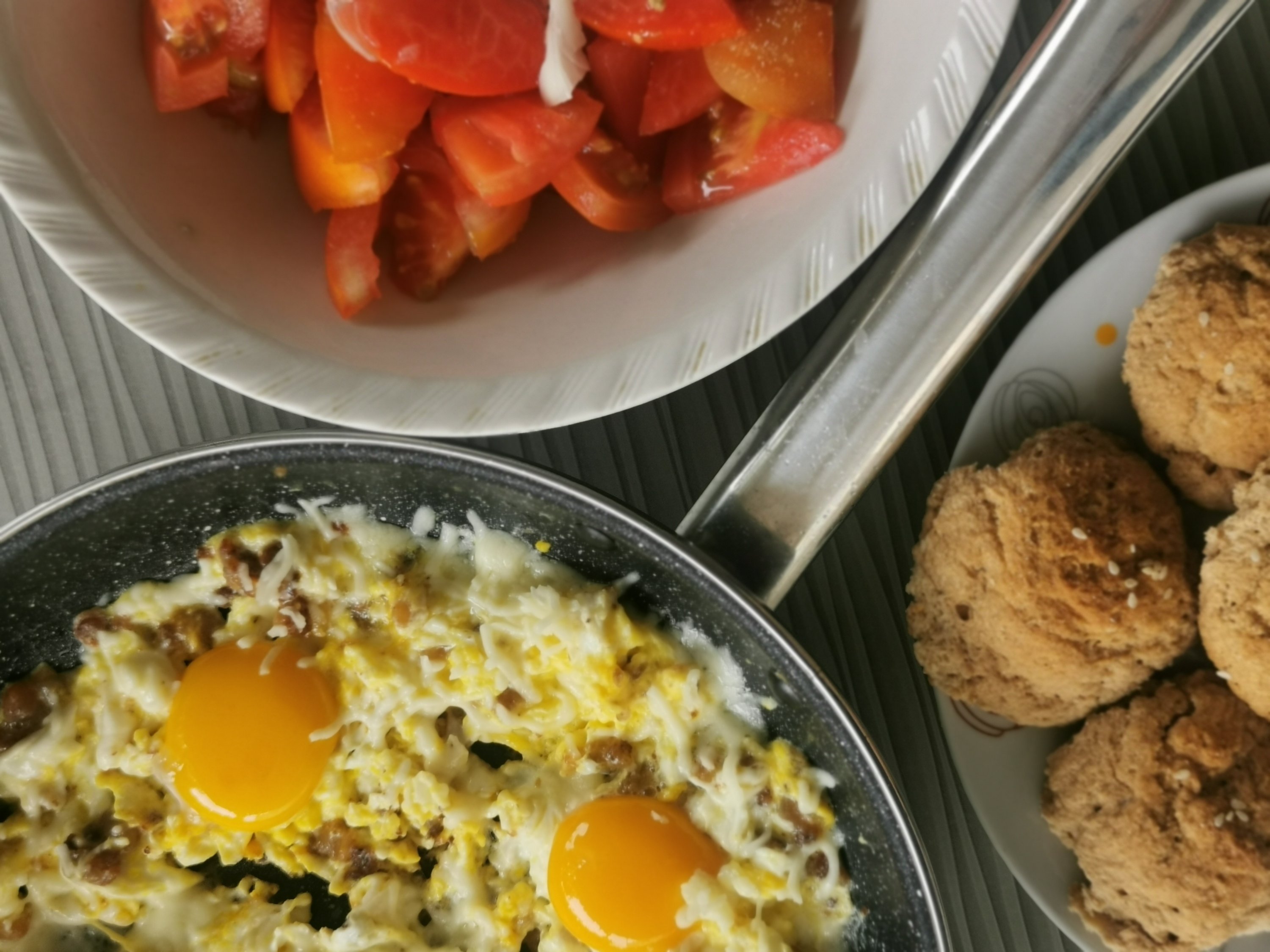 LCHF: pečena jajčka s mocarelo, vlakninske bombetke, paradižnikova solata