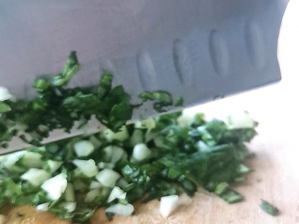 Baziliko in česen dobro sesekljamo in premešamo z ostalimi sestavinami.