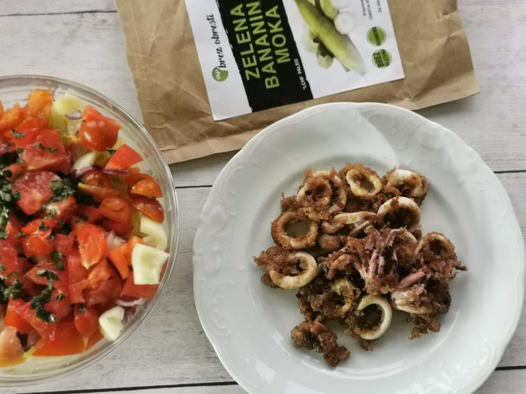 💡 Očiščene in narezane lignje smo za tri ure namočili v pinjenec, nato smo jih posušili in pomokali v mešanico iz zelene bananine moke, rdeče paprike, česna v prahu in soli ter ocvrli v vročem olju v voku.