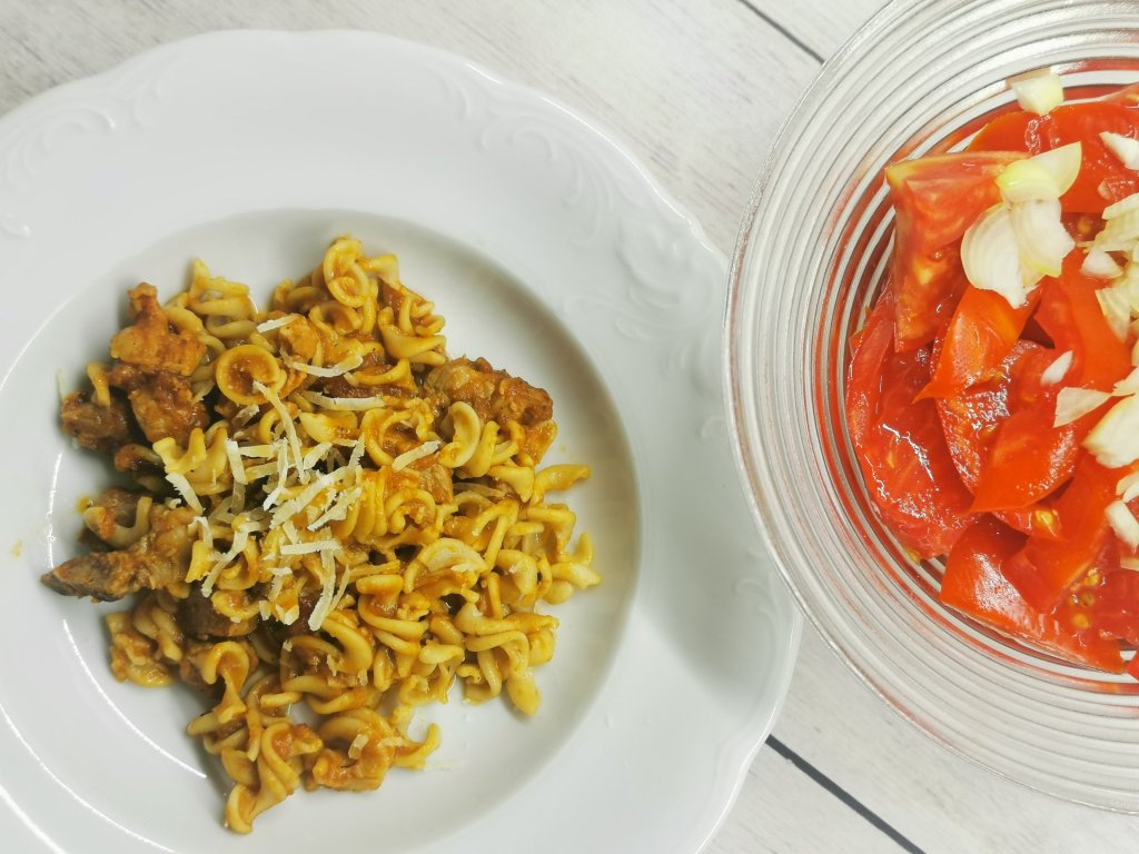 LCHF: Makaronovo meso s sezamovimi svederčki, paradižnikova solata