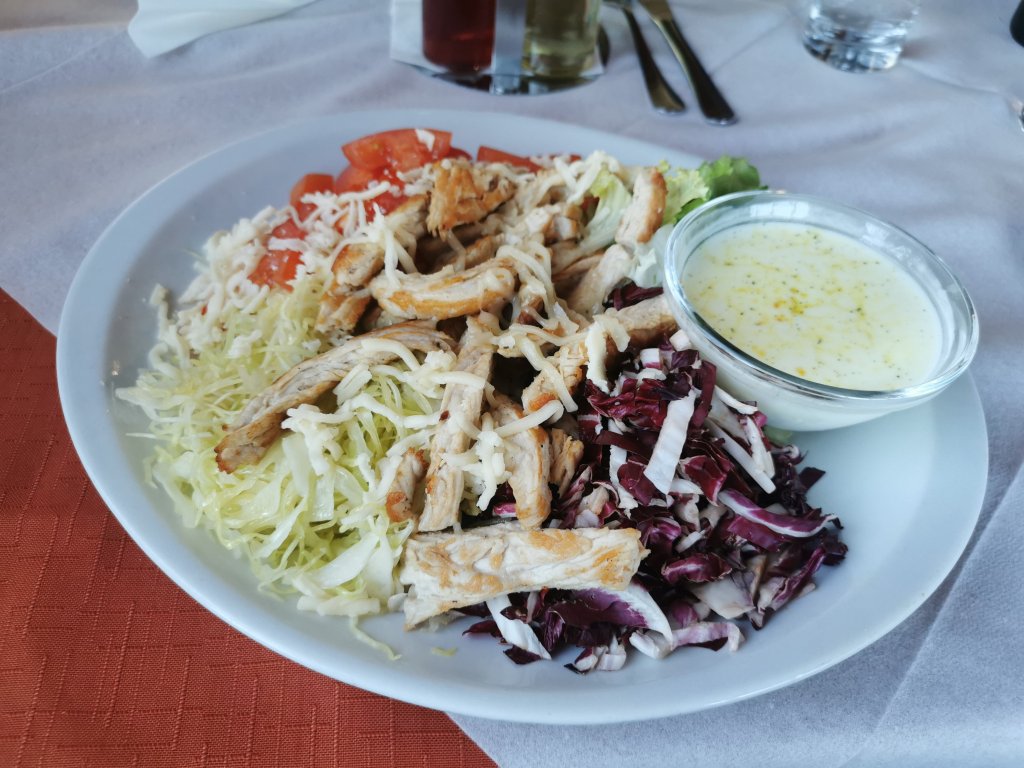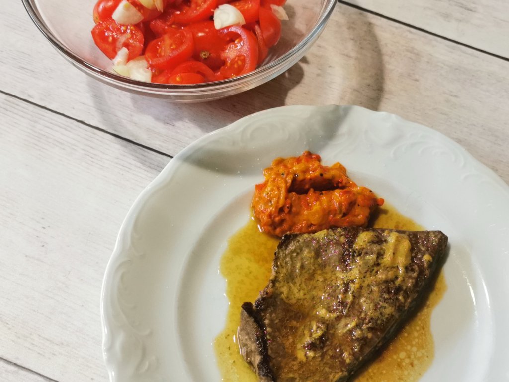 LCHF: Popečeni koščki puranjega mesa z bučkami in paradižnikovo omako, kuhana cvetača, solata