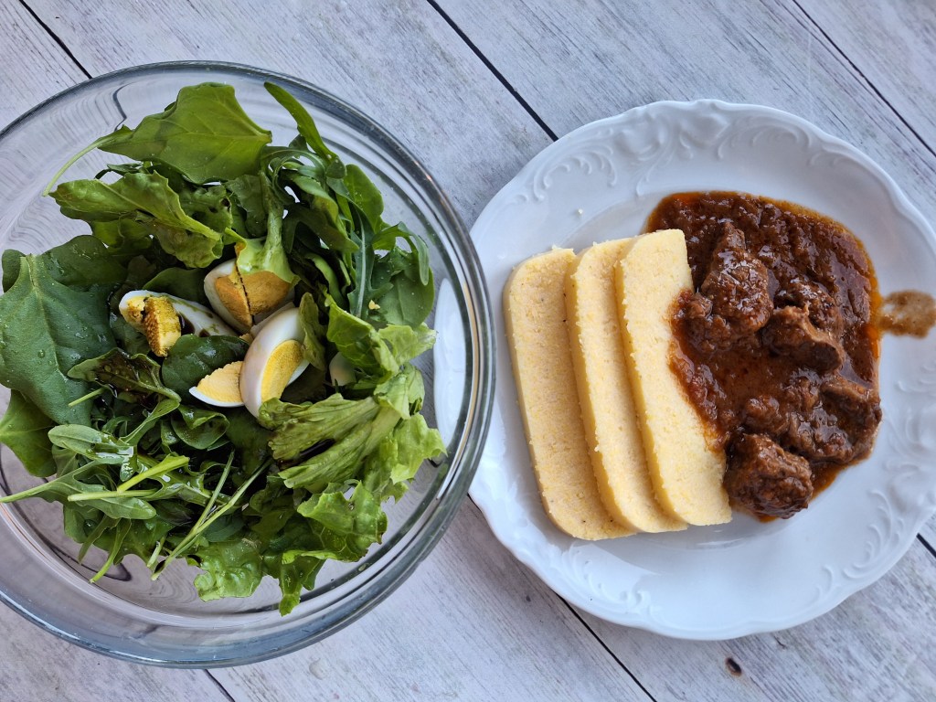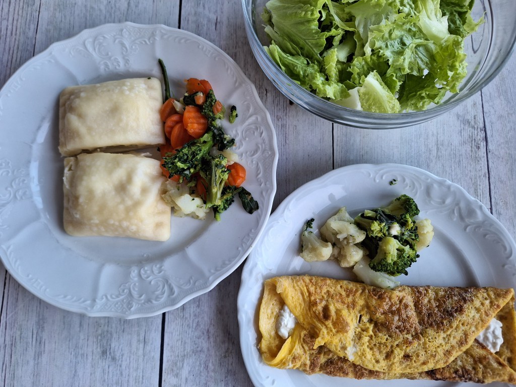 LCHF: jajÄna omleta z zrnatim sirom, kuhana zelenjava, solata
