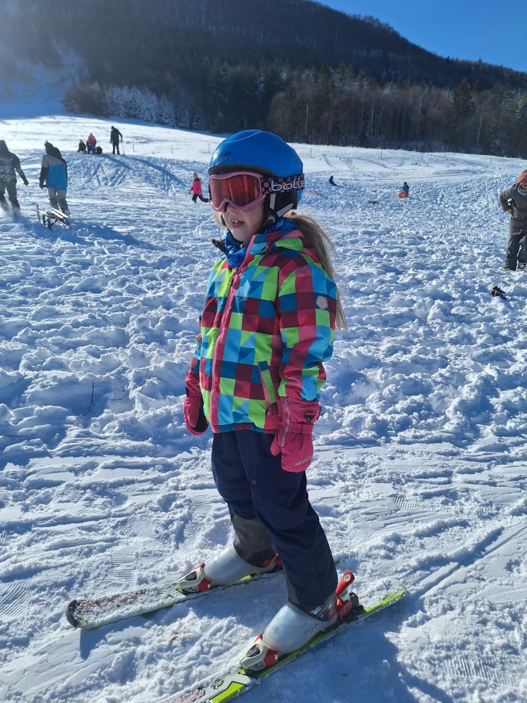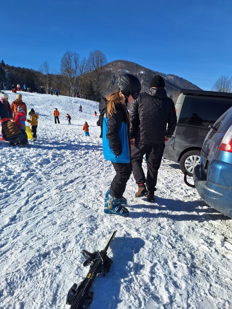 V nedeljo smo šli na Črni vrh. Jurij in Hana sta smučala, ostali pa sedeli na toplem.