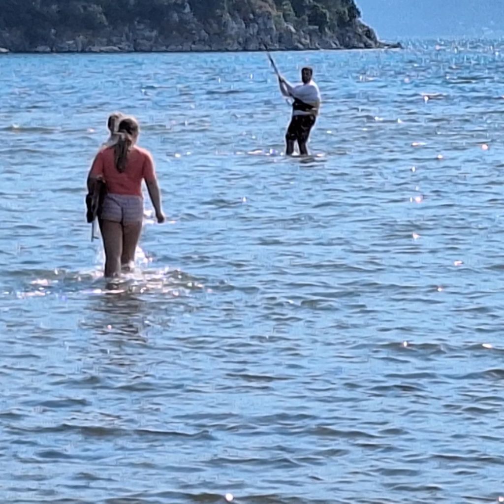 Po počitku smo šli na spot, kjer je Matej imel učne urice s Hano in Jurijem, Pika je tekala po plaži, jz pa sem v senci dežurala s hrano in suhimi brisačami.